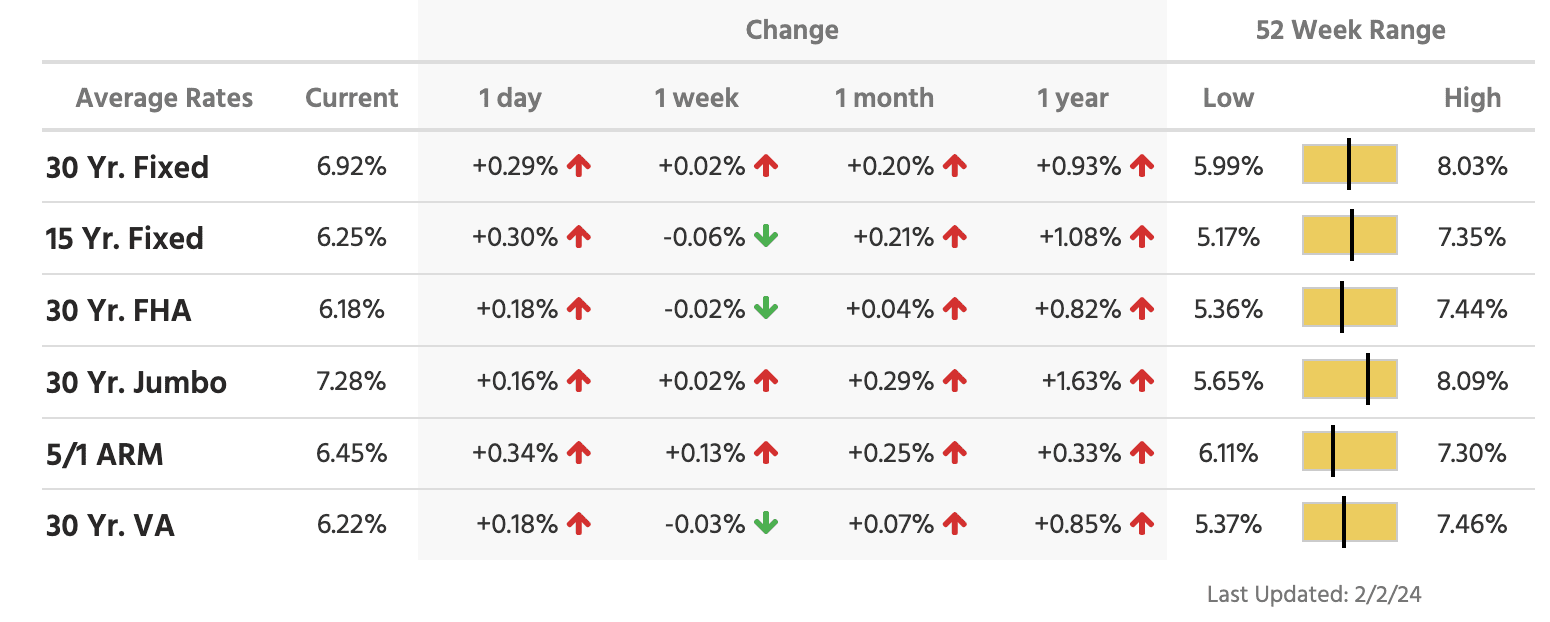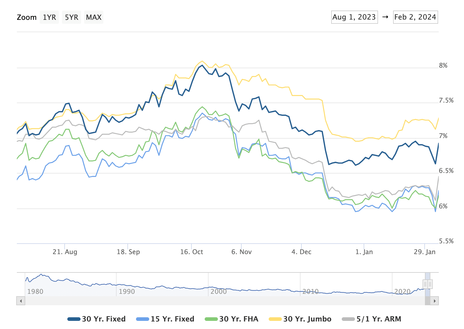 Firstly, mortgage rates have started to give a relatively small, but welcome, decrease since their high in late fall of 2023. The average 30y rate for January came in at 6.92%, and it has not been unheard of for strong borrowers to break into the low sixes. With the Federal Reserve Holding rates steady at their meeting last week, there is reason for cautious optimism about rate drops at some point in 2024.