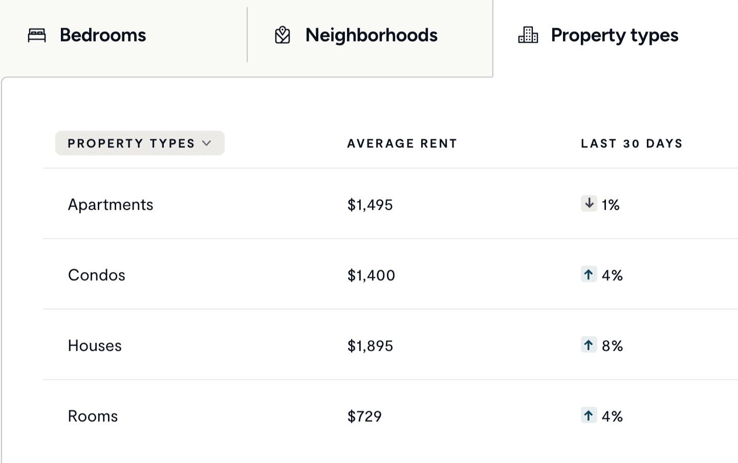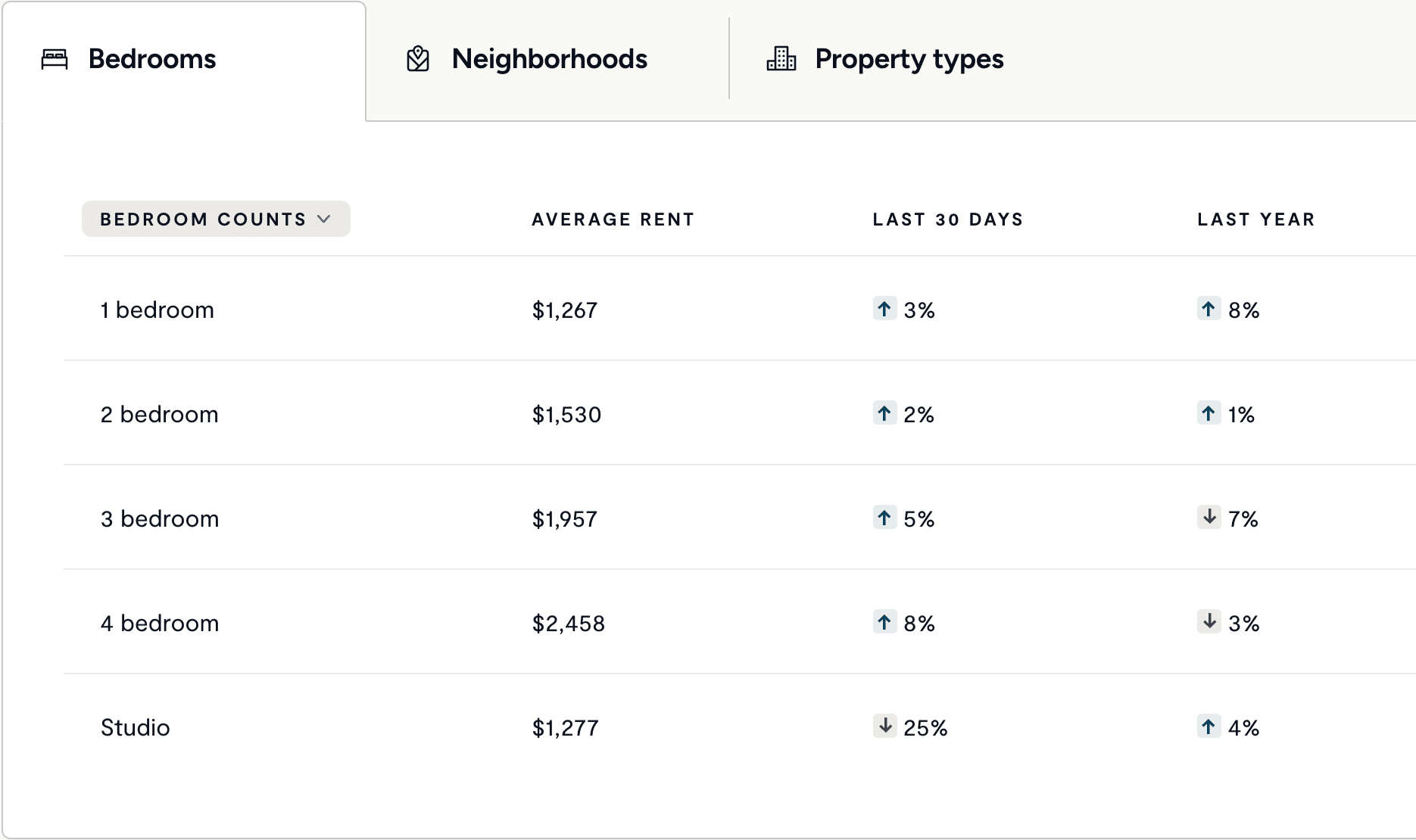 Current rents are shown in the charts above, broken down by bedroom count, neighborhood, and property type, to help guide your investment analysis.
