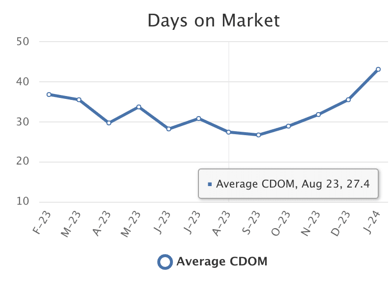 4. Days on Market: Probably the most interesting market dynamic I am following. Days on Market, or the amount of time it takes a home to sell, has been rising consistently since the fall.