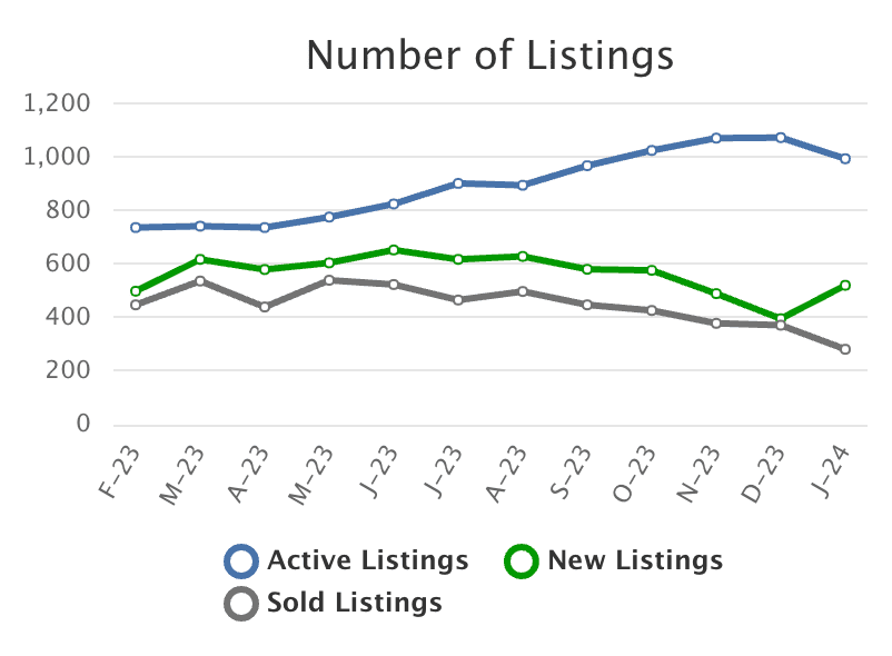 1. Number of Listings: There were a steadily rising number of active listings throughout the year in 2023, with the typical slight decrease in new listings around the holidays. Buyers are slowly gaining more options.